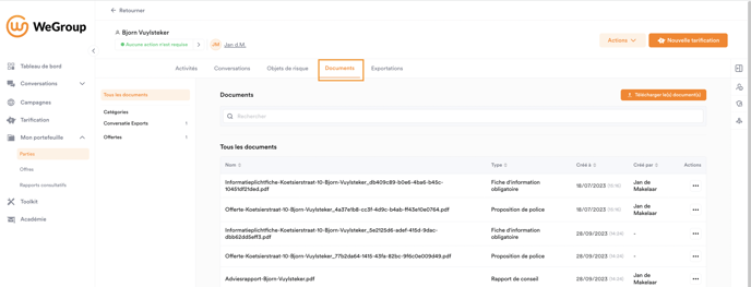 Dans Mon portefeuille > Parties, vous trouverez toutes les informations relatives à vos parties. Cliquez sur 'Documents' pour voir également tous les documents liés à cette partie.